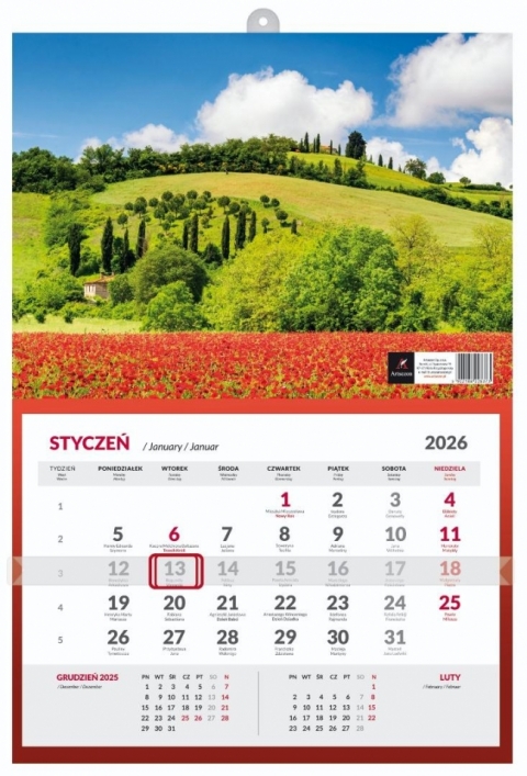 dostępny w 12 wzorach, kalendarium miesięczne + miniatury 2 miesięcy, główka kaszerowana, pasek PCV z okienkiem do zaznaczenia bieżącego dnia, rozmiar 51x35cm, zawieszka