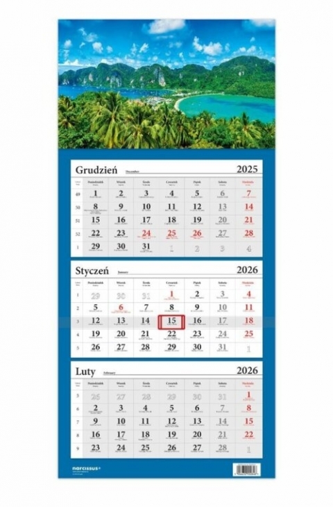 Kalendarz 2026 LUX Trójdzielny Egzotyczny raj, TajlandiaKlasyczny kalendarz trójdzielny na 2026 rok, podłużny z wypukłą, elegancką główką oraz opaską z przesuwnym okienkiem do zaznaczenia wskazanego dnia. Kalendarz można złożyć w 3 miejscach. Zawiera 3 odrębne, zrywane kalendaria po 12 kartek. Kalendarz jest zapakowany w folię ochronną. Sposób zawieszania - otwór w górnej częściWymiary rozłożonego kalendarza to 32 x 67 cmWyprodukowano w Polsce
