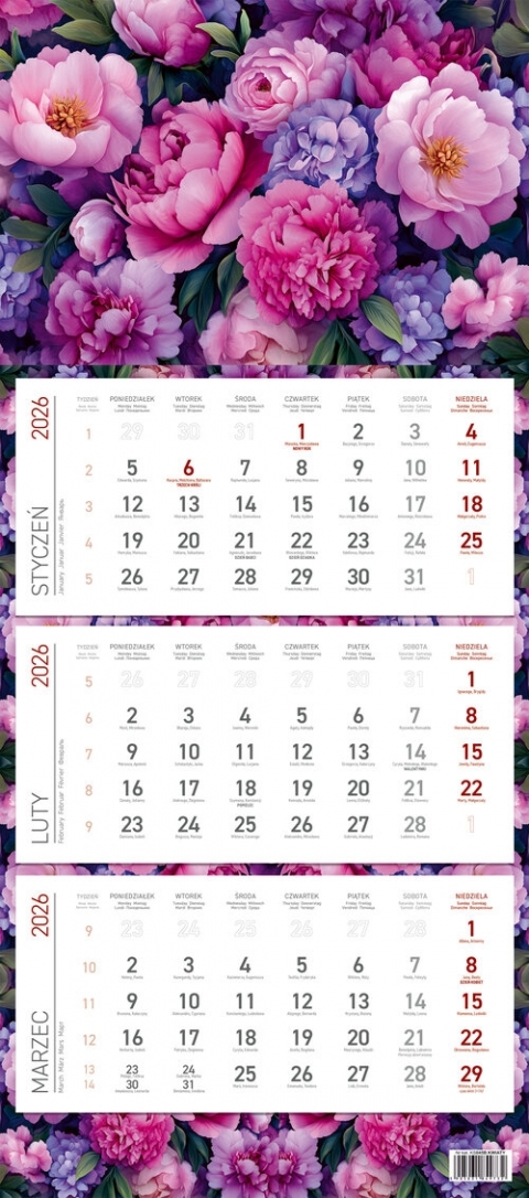 Kalendarz 2026 trójdzielny ekonomiczny KWIATY