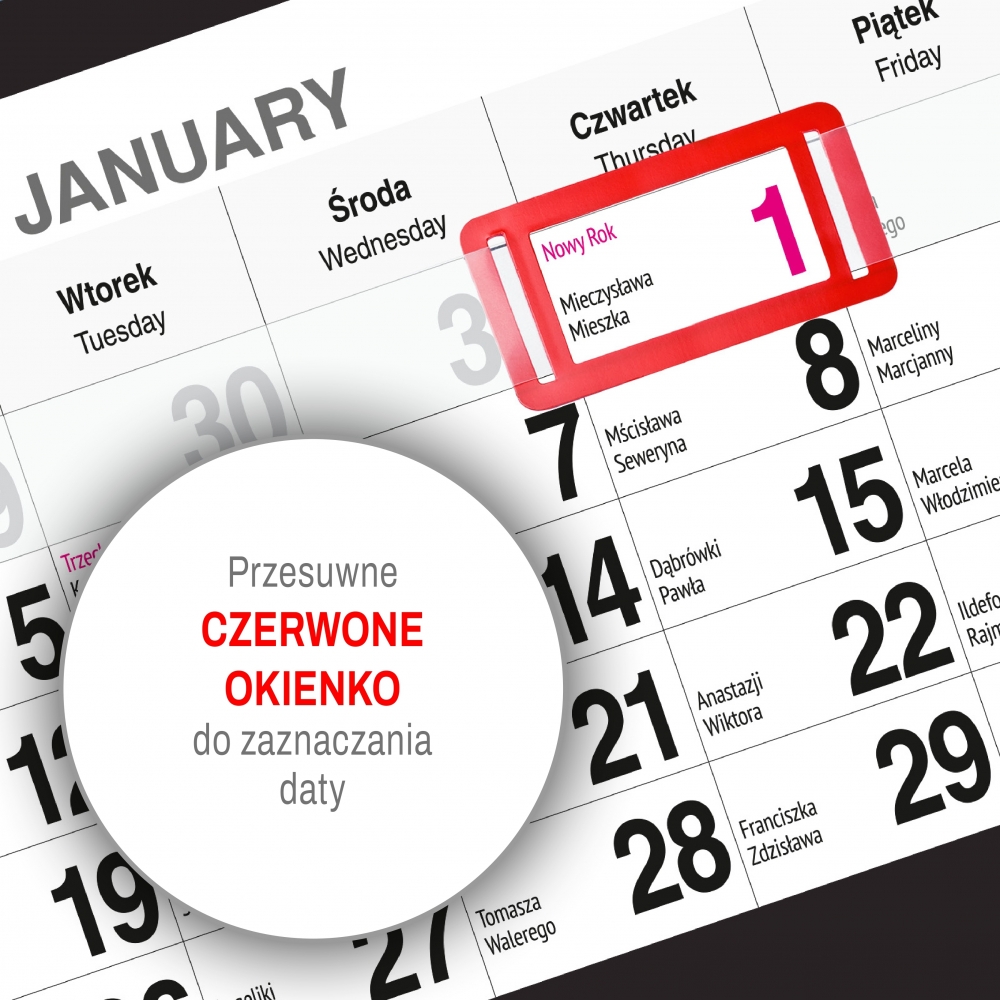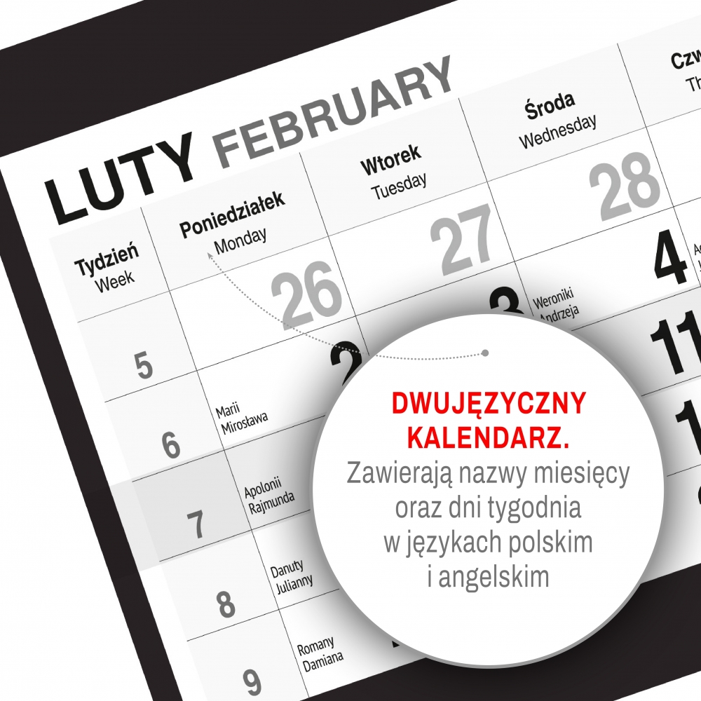 - Zawiera czytelne kalendarium z imieninami i świetami w języku polskim