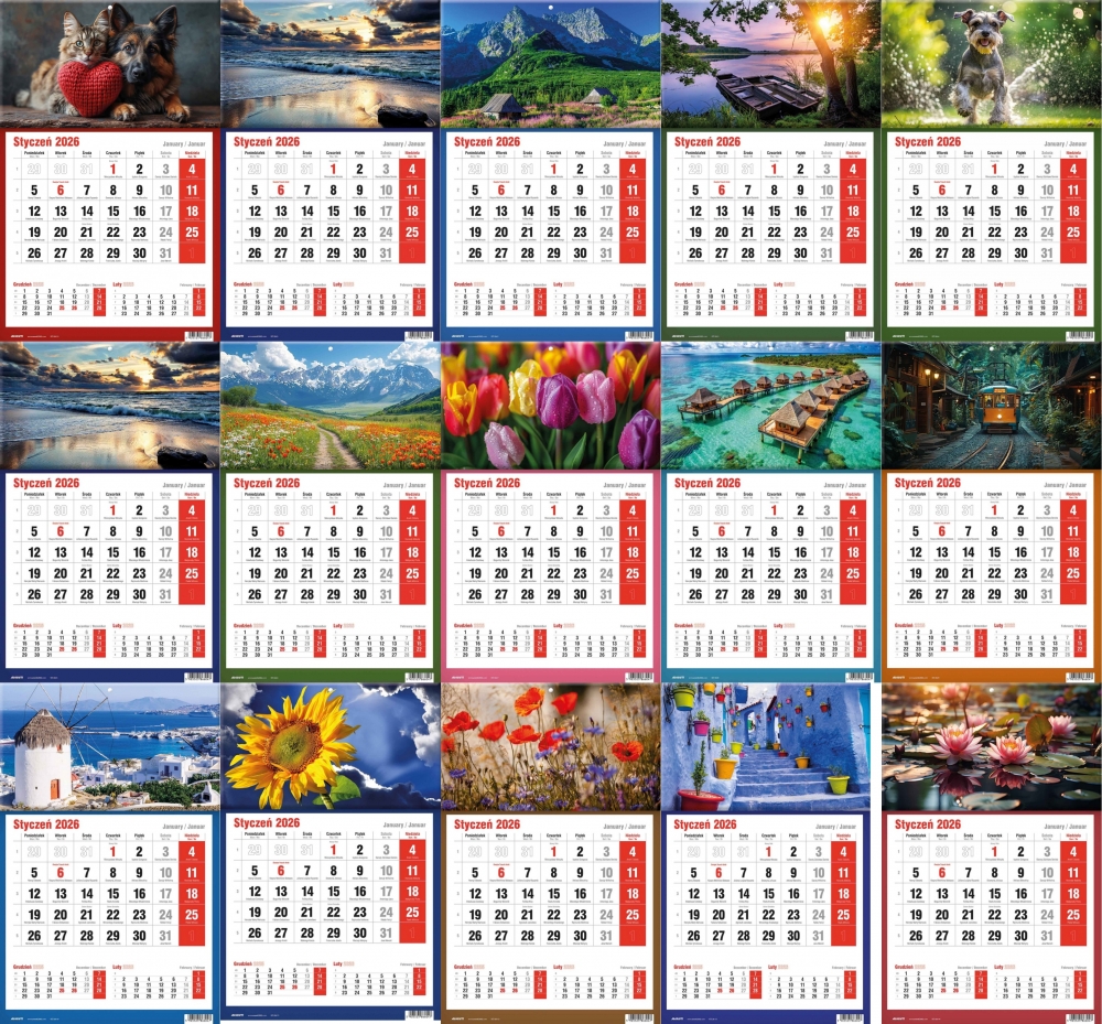 Kalendarz Jednodzielny pasuje wszędzie tam, gdzie na trójdzielny brakuje miejsca, a zależy nam na podglądzie poprzedniego i następnego miesiąca. Kalendaria zawierają oznaczenia miesięcy i dni tygodnia w trzech językach (PL, EN, DE) oraz imieniny i typowe święta.
