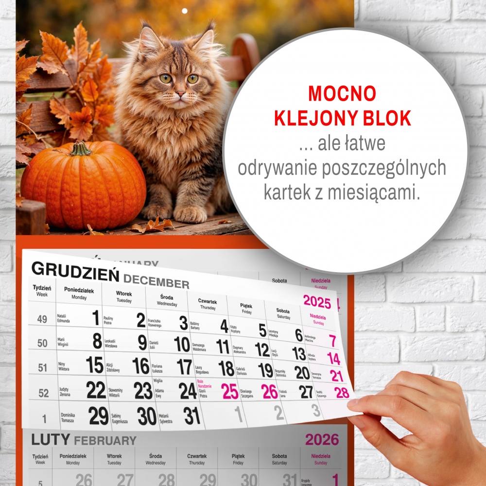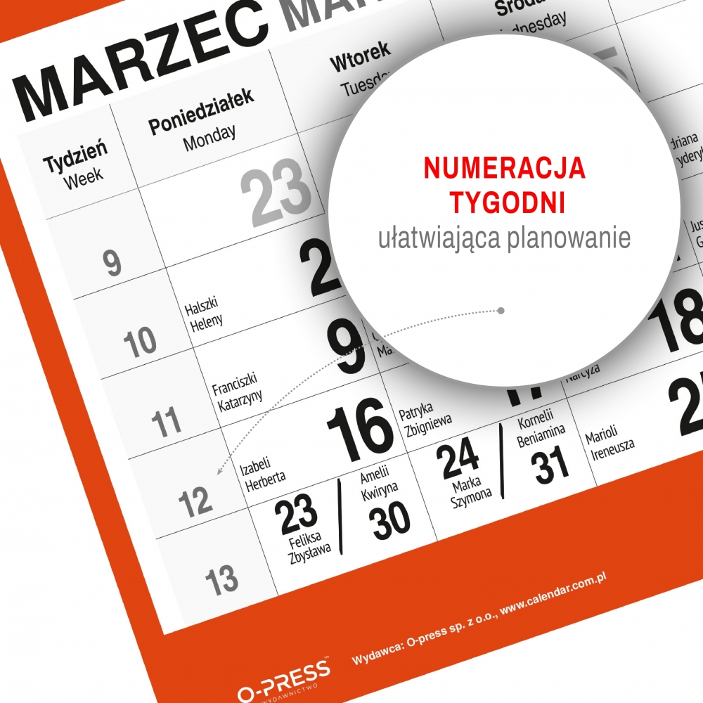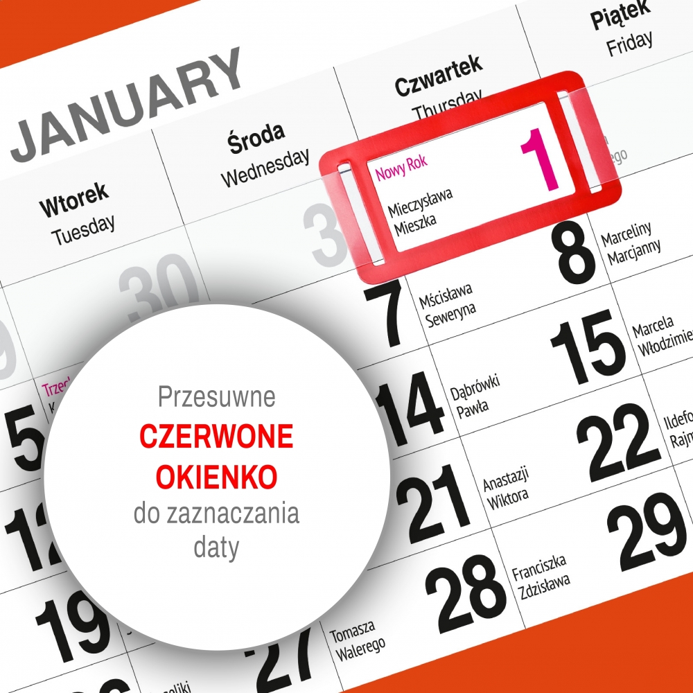 - Zawiera czytelne kalendarium z imieninami i świetami w języku polskim