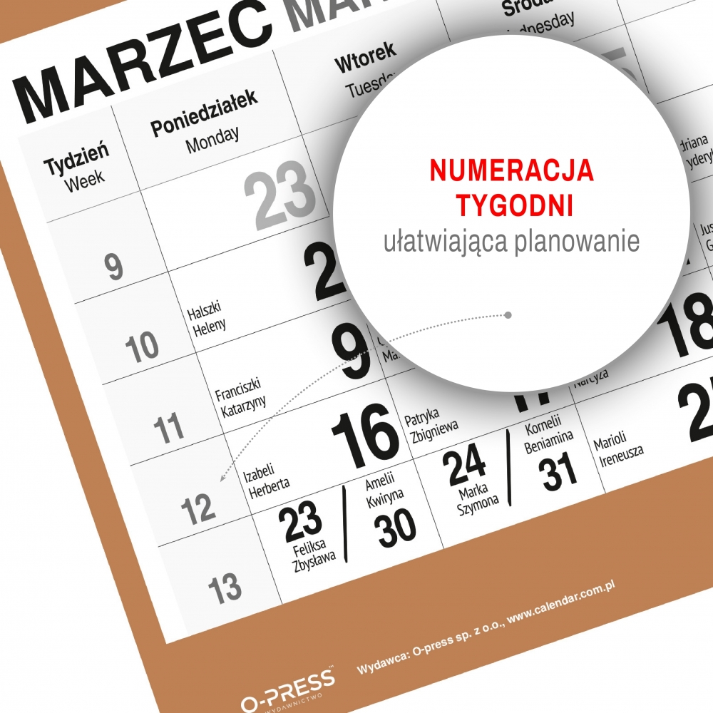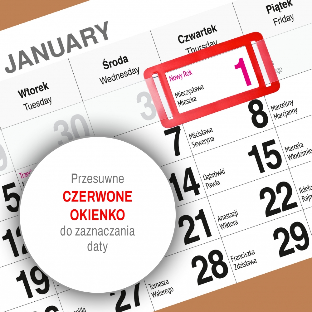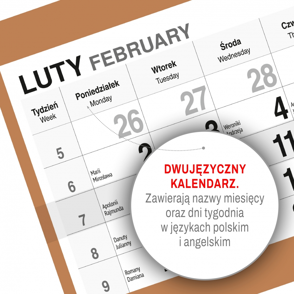 - Zawiera czytelne kalendarium z imieninami i świetami w języku polskim