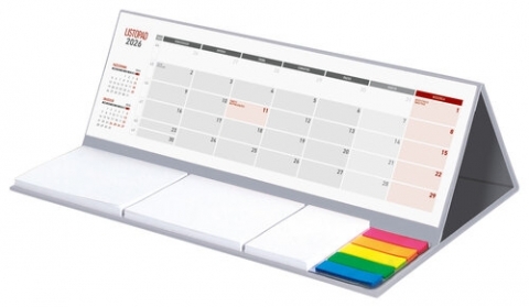 •nr katalogowy: KB062B•układ: miesięczny•format kalendarium: 309 x 99 mm•druk: 2+0•format kalendarza: 315 x 192 x 112 mm•foliowany pojedynczo Wygodny kalendarz stojący na biurko z przejrzystym kalendarium w układzie miesięcznym z poręcznymi karteczkami samoprzylepnymi do notowania. Przydatny zwłaszcza w biurze. W kalendarzu zaznaczono święta. Na tylnej części kalendarza istnieje możliwość wykonania nadruku reklamowego na obszarze o wymiarach 305 x 100 mm.Część informacyjna kalendarza zawiera:•Kalendarium 2026•Miesiąc bieżący, poprzedni i następny•Daty świąt•Samoprzylepne kartki do notowania•Kolorowe znaczniki