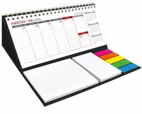 •nr katalogowy: KB044B•układ: tygodniowy•format kalendarium: 204 x 99 mm•druk: 2+0•format kalendarza: 210 x 192 x 112 mm•foliowany pojedynczo Wygodny kalendarz stojący na biurko z przejrzystym kalendarium w układzie tygodniowym z poręcznymi karteczkami samoprzylepnymi do notowania. Przydatny zwłaszcza w biurze. W kalendarzu zaznaczono święta. Część informacyjna kalendarza zawiera:•Kalendarium 2026•Miesiąc bieżący, poprzedni i następny•Daty świąt•Samoprzylepne kartki do notowania•Kolorowe znaczniki