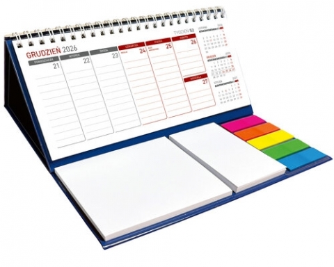 •nr katalogowy: KB044B•układ: tygodniowy•format kalendarium: 204 x 99 mm•druk: 2+0•format kalendarza: 210 x 192 x 112 mm•foliowany pojedynczo Wygodny kalendarz stojący na biurko z przejrzystym kalendarium w układzie tygodniowym z poręcznymi karteczkami samoprzylepnymi do notowania. Przydatny zwłaszcza w biurze. W kalendarzu zaznaczono święta. Część informacyjna kalendarza zawiera:•Kalendarium 2026•Miesiąc bieżący, poprzedni i następny•Daty świąt•Samoprzylepne kartki do notowania•Kolorowe znaczniki