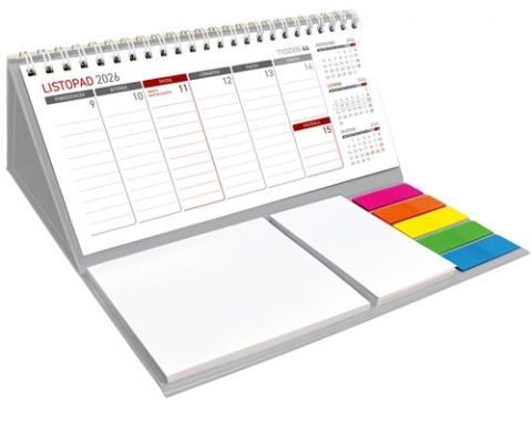•nr katalogowy: KB044B•układ: tygodniowy•format kalendarium: 204 x 99 mm•druk: 2+0•format kalendarza: 210 x 192 x 112 mm•foliowany pojedynczo Wygodny kalendarz stojący na biurko z przejrzystym kalendarium w układzie tygodniowym z poręcznymi karteczkami samoprzylepnymi do notowania. Przydatny zwłaszcza w biurze. W kalendarzu zaznaczono święta. Część informacyjna kalendarza zawiera:•Kalendarium 2026•Miesiąc bieżący, poprzedni i następny•Daty świąt•Samoprzylepne kartki do notowania•Kolorowe znaczniki