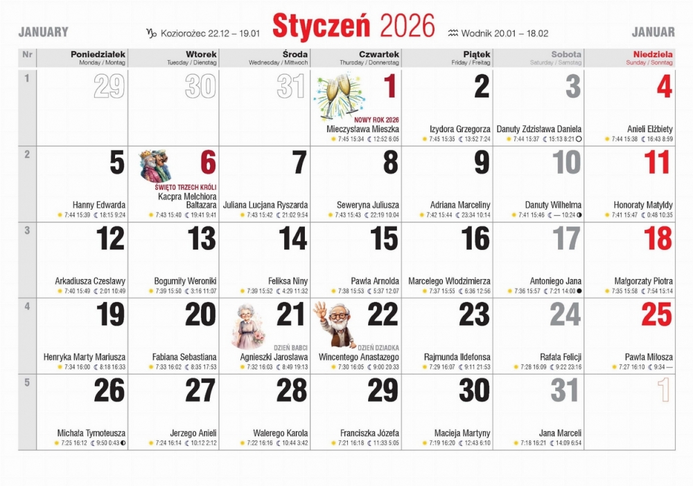 - nazwy miesięcy i dni tygodnia po polsku, angielsku i niemiecku