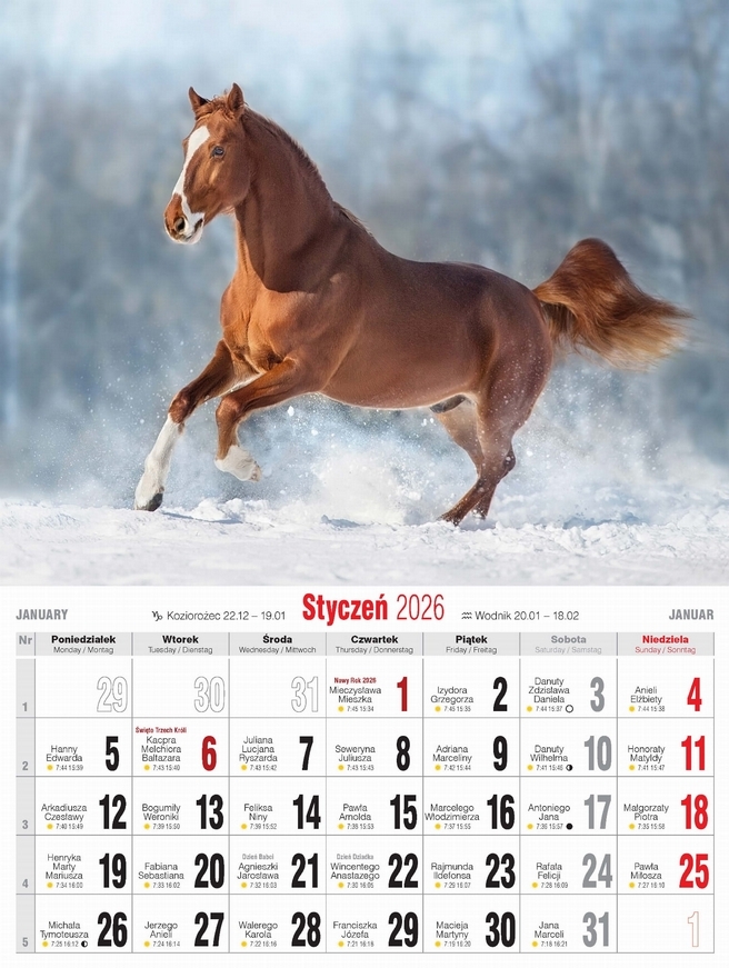 - Wygodny, niewielki kalendarz ścienny, drukowany na papierze kredowym w oprawie spiralnej.