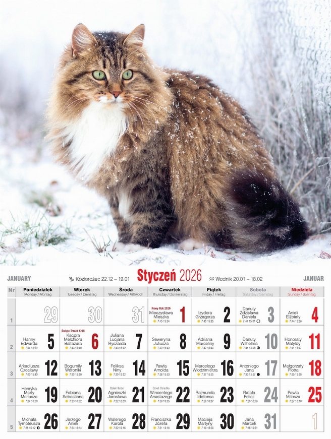 - Wygodny, niewielki kalendarz ścienny, drukowany na papierze kredowym w oprawie spiralnej.