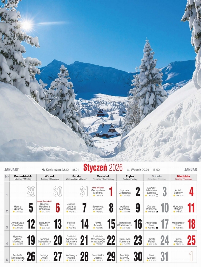 - Wygodny, niewielki kalendarz ścienny, drukowany na papierze kredowym w oprawie spiralnej.