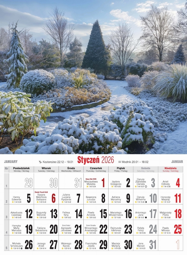 - Wygodny, niewielki kalendarz ścienny, drukowany na papierze kredowym w oprawie spiralnej.