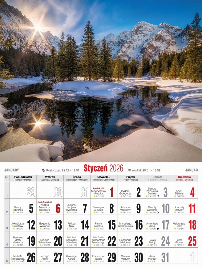 - Wygodny, niewielki kalendarz ścienny, drukowany na papierze kredowym w oprawie spiralnej.