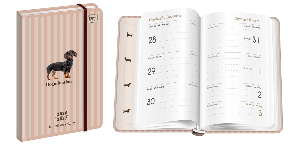 - Dodatkowo w środku kalendarza: kalendarz skrócony, planer miesięczny, plan lekcji, miejsce na własne notatki i kontakty oraz lista ważnych dat i świąt.