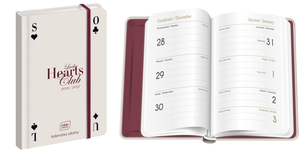 - Dodatkowo w środku kalendarza: kalendarz skrócony, planer miesięczny, plan lekcji, miejsce na własne notatki i kontakty oraz lista ważnych dat i świąt.