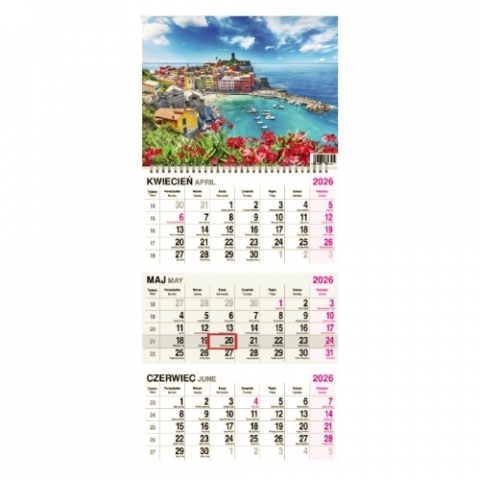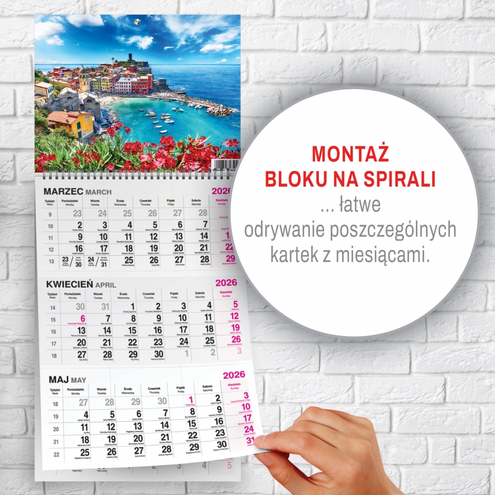 Kalendarz został połączony solidną spiralą z eurozawieszką, która umożliwia łatwe i bezpieczne zawieszenie go na ścianie. Format 280x635 mm gwarantuje czytelność kalendarium oraz komfort użytkowania, a spiralne łączenie zapewnia wygodę podczas przewracania stron i estetyczny wygląd.