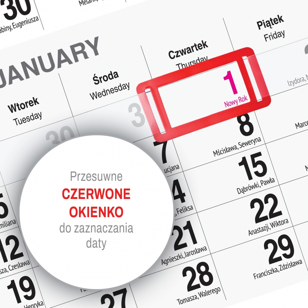 - Zawiera czytelne kalendarium z imieninami i Świetami w języku polskim