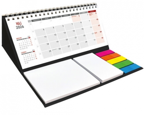 •nr katalogowy: KB053B•układ: miesięczny•format kalendarium: 309 x 99 mm•druk: 2+0•format kalendarza: 315 x 192 x 112 mm•foliowany pojedynczo Wygodny kalendarz stojący na biurko z przejrzystym kalendarium w układzie miesięcznym z poręcznymi karteczkami samoprzylepnymi do notowania. Przydatny zwłaszcza w biurze. W kalendarzu zaznaczono święta. Kalendarium spiralowane. Część informacyjna kalendarza zawiera:•Kalendarium PL 2026•Miesiąc bieżący, poprzedni i następny•Daty świąt•Samoprzylepne kartki do notowania•Kolorowe znaczniki