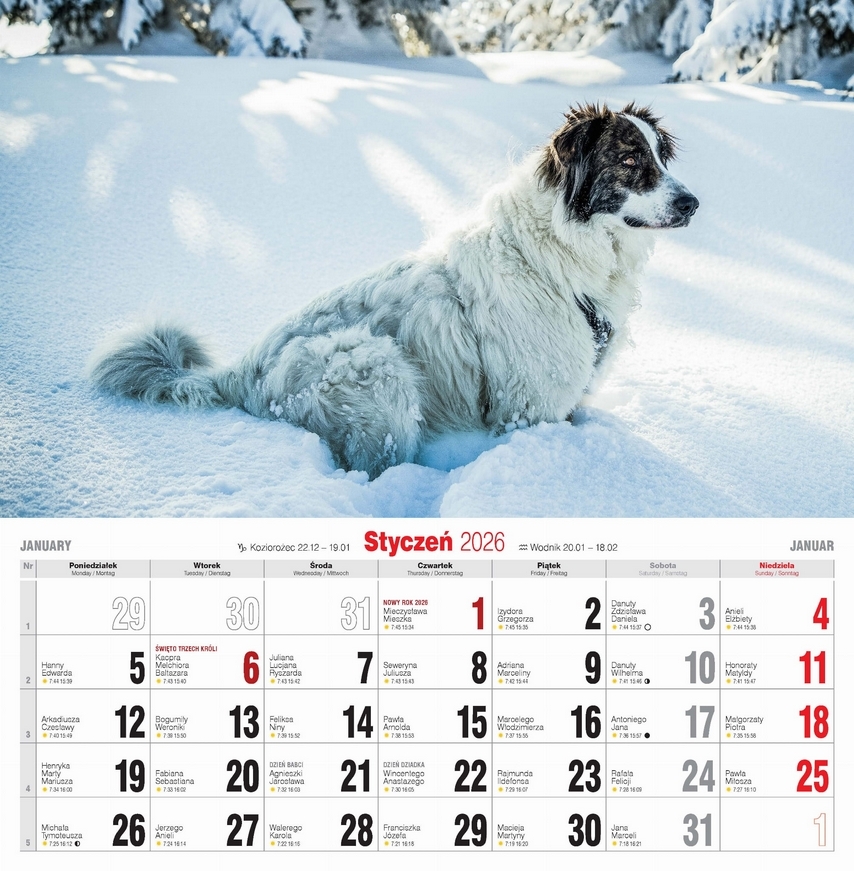 - Duży, solidny kalendarz ścienny, drukowany na papierze kredowym.