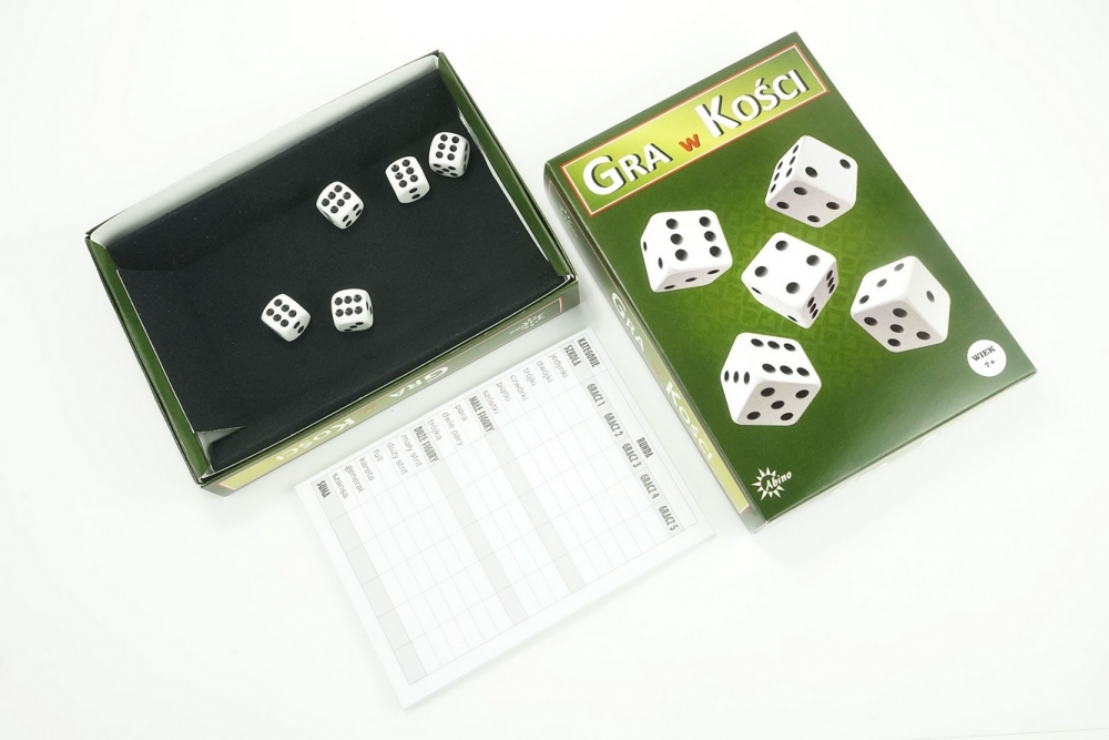 Gra w kości z profesjonalnym bloczkiem do zapisywania wyników oraz z pudełkiem z welurową wyściółką.