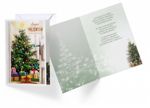 Kartka wielkości B6, zdobiona w zależności od wzoru metaliczną folią lub brokatem. Każda kartka posiada kolorowe życzenia w środku i koperte.