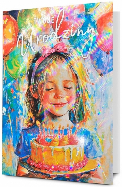 Kartka jest zdobiona opalizującą folią holograficzną, zawiera życzenia oraz kolorowy środek. W zestawie znajduje się koperta, kolorystycznie uzupełniająca się z kartką. Format złożonej kartki: B6