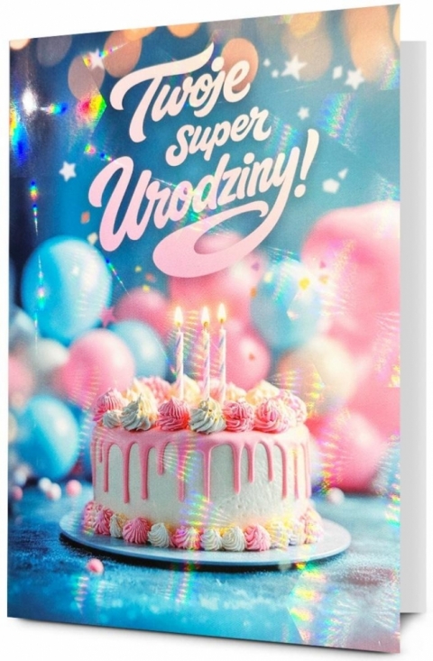 Kartka jest zdobiona opalizującą folią holograficzną, zawiera życzenia oraz kolorowy środek. W zestawie znajduje się koperta, kolorystycznie uzupełniająca się z kartką. Format złożonej kartki: B6