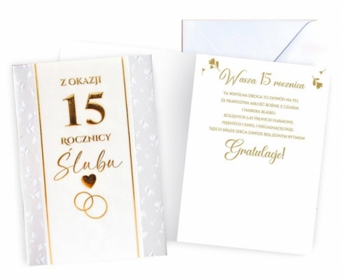 Kartka Dream Cards "Z okazji 15. rocznicy ślubu" DK-1336 Kartka B6 z ozdobnej serii Dream Cards - nieduża, ale robi wrażenie dzięki atrakcyjnej kolorystyce i ciekawym zdobieniom. To idealny wybór łączący przyjazną cenę z jakością. Cechy szczególne: wielkość: B6, 16.6 x 11.7 cm po złożeniu, koperta: w zestawie, kolorowa, zdobienia: kolorowe, różnorodne, bogate (w zależności od wzoru: przyklejane dekoracje, elementy biżuteryjne, odstawniki, metaliczne folie, tłoczenia itp.), okazja: Rocznica