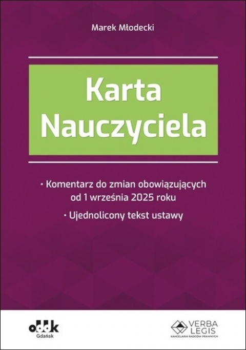 Trzema ustawami z dnia 25 lipca 2025 r. wprowadzono szereg ważnych zmian w Karcie Nauczyciela obowiązujących od 1 września 2025 r., 1 stycznia 2026 r. oraz 1 września 2026 r.W publikacji skomentowano zmiany w zakresie m.in.: zatrudnienia nauczyciela początkującego, skrócenia okresu zatrudnienia nauczyciela niemającego stopnia awansu zawodowego, obliczania wynagrodzenia nauczycieli za godziny ponadwymiarowe i godziny zastępstw doraźnych, przesunięcia terminów wypłaty niektórych składników wynagrodzenia, przydzielania nauczycielom zastępstw doraźnych, zatrudniania w niepublicznych szkołach i placówkach nauczycieli specjalistów, skorzystania z urlopu dla poratowania zdrowia na leczenie uzdrowiskowe lub rehabilitację uzdrowiskową, rozszerzenia grupy nauczycieli uprawnionych do nauczycielskiego świadczenia kompensacyjnego, ochrony przedemerytalnej, odpraw emerytalnych i nagród jubileuszowych, wymiaru godzin zajęć nauczycieli praktycznej nauki zawodu.Książka zawiera ujednolicony tekst ustawy z dnia 26 stycznia 1982 r. – Karta Nauczyciela z wyróżnieniem wprowadzonych zmian.