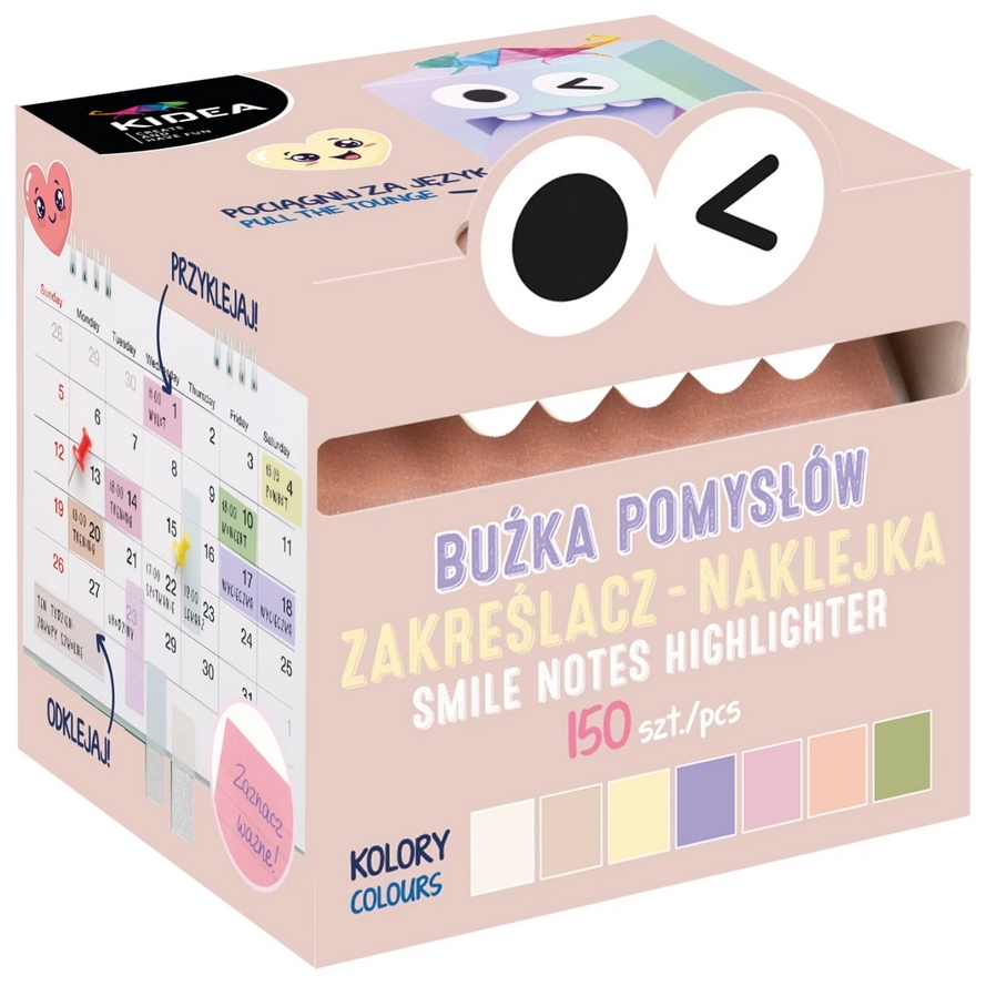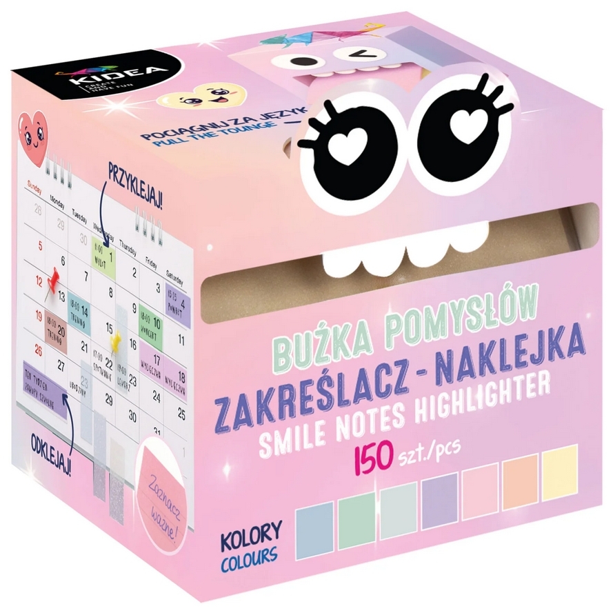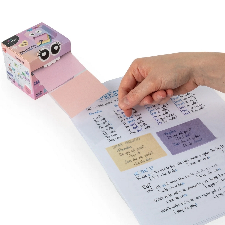To przezroczyste karteczki, samoprzylepne do zaznaczania ważnych fragmentów w książce, zeszycie czy notatkach. Przyklejasz je na tekst, który chcesz wyróżnić, a jeśli później zmienisz zdanie, po prostu odklejasz bez trwałych śladów jak przy klasycznym zakreślaczu. W środku znajdziesz rolkę 150 karteczek w 7 kolorach z delikatnym brokatem. Karteczki łatwo się odrywają, bo rolka „wysuwa się” z buzi stworka jak języczek, a opakowanie w kształcie uroczego stworka sprawia, że korzystanie z nich jest po prostu przyjemne.
