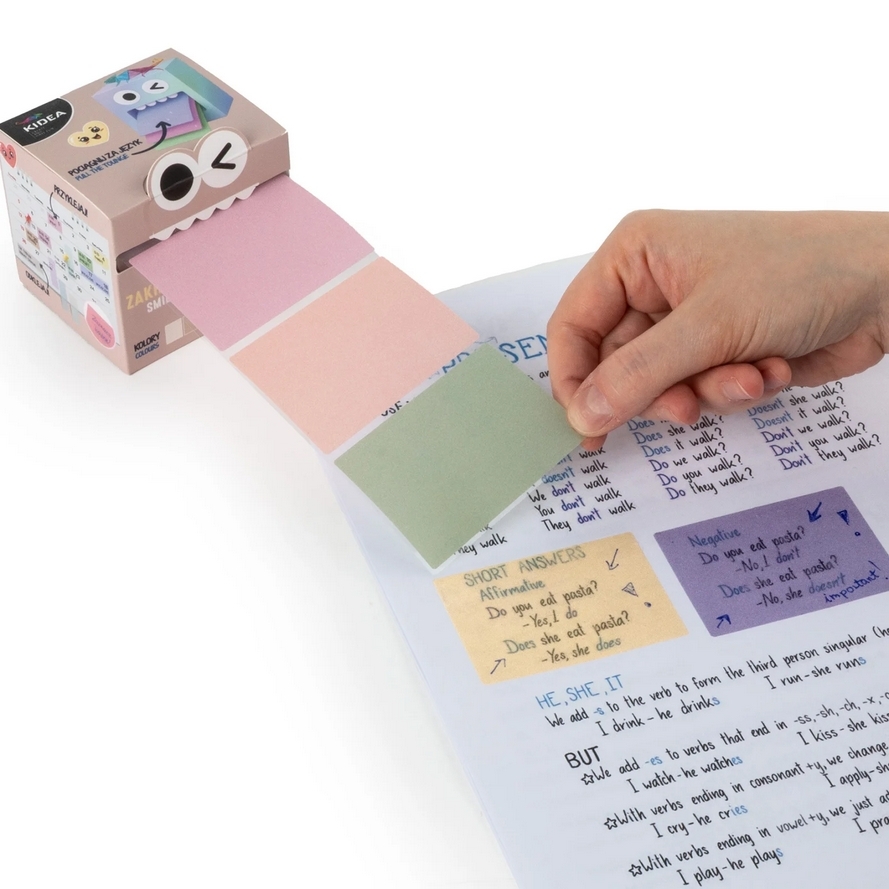 Co ważne, na karteczkach możesz normalnie dopisać własną notatkę długopisem: hasło, datę, komentarz albo pytanie do fragmentu. Gdy notatka przestanie być potrzebna, zdejmujesz karteczkę.