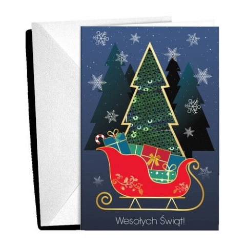 Kartka z życzeniami z dopasowaną kolorystycznie kopertą. Ozdobę stanowią cekiny, złocenie i elementy 3D. Całość zabezpieczona folią typu"open".