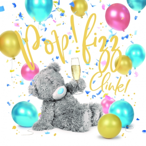 Kartka holograficzna 3D - Miś z kieliszkiem szampana