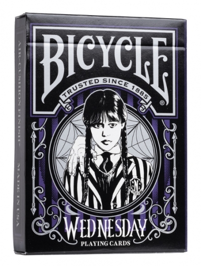 Wkrocz do mrocznego świata Akademii Nevermore z Bicycle Wednesday! Zainspirowana hitowym serialem Netflixa z Jenną Ortegą w roli Wednesday Addams; Twoja następna gra karciana to pełen emocji taniec z makabrą, gdy tasujesz atramentowo-czarne karty z ulubionymi przez fanów postaciami z serialu.