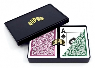 Zestaw pakowany w plastikowe pudełko idealne do ich przechowywania, Każda talia zawiera 52 karty, 2 jokery i 1 kartę gwarancyjną.