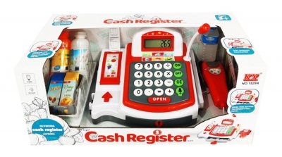Kasa sklepowa z akcesoriami. Zabawka interaktywna w postaci kasy sklepowej z wyświetlaczem, mikrofonem i skanerem. W zestawie akcesoria spożywcze i butelki. Posiada efekty dźwiękowe i świetlne.