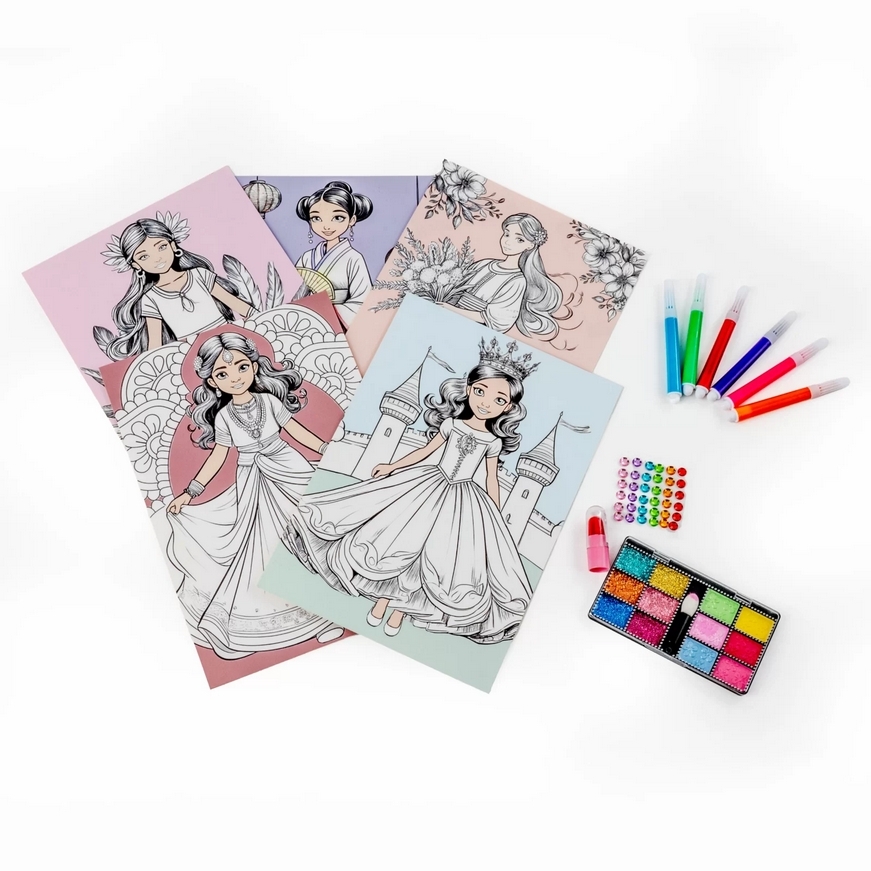 Plansze do kolorowania beauty. Dla małych artystek, które pragną wcielić się w rolę prawdziwej projektantki mody. Zestaw obejmuje 5 plansz z motywami księżniczek w oryginalnych strojach i sukniach, 1 szminkę, 6 mini markerów, 36 diamentów oraz 12 cieni. Dzięki bogatemu wyposażeniu można stworzyć unikatowe stylizacje dla każdej z postaci – od romantycznych, kwiecistych kreacji po eleganckie, wieczorowe stroje.