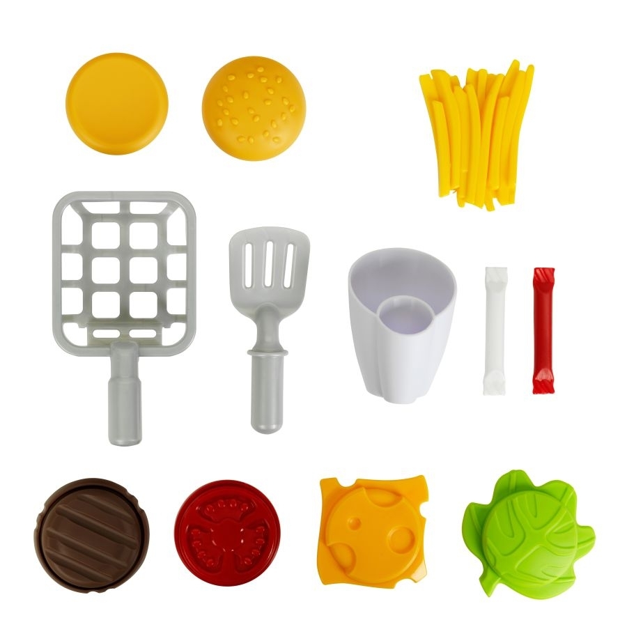 Mali kucharze staną się prawdziwymi mistrzami przekąsek! Ten starannie zaprojektowany zestaw kuchenny do zabawy zawiera wszystko, czego potrzeba do przygotowania idealnego burgera. Dzieci mogą kreatywnie złożyć burgera z 6 elementów, podać frytki w kubku i dodać ketchup lub majonez, zupełnie jak w prawdziwej kuchni. Łopatka i koszyk frytek uzupełniają zestaw i zachęcają do pomysłowej zabawy w odgrywanie ról. Oprócz świetnej zabawy, dzieci rozwijają sprawność motoryczną i odkrywają swoje pierwsze kulinarne talenty!