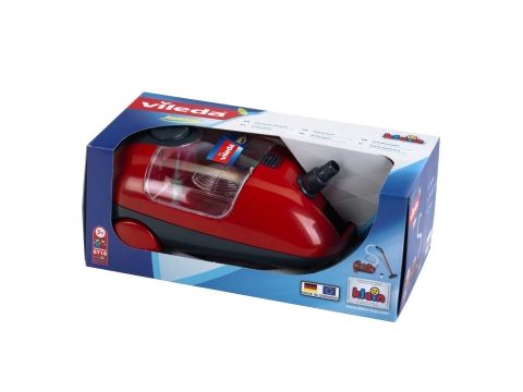 Odkurzacz powstał na licencji firmy Vileda, dlatego też jest wierną kopią prawdziwego odkurzacza tej marki. Zabawka jest w kolorze czerwonym z czarnymi elementami i jasną, elastyczną rurą o długości około 50 cm. Odkurzacz posiada przezroczysty zbiorniczek, do którego wpada dołączony do zestawu specjalny granulat, który odkurzacz wciąga podczas zabawy. Podczas zabawy silniczek odkurzacza wydaje dźwięk naśladujący odgłos prawdziwego odkurzacza, dzięki czemu zabawa nim jest jeszcze bardziej realistyczna. Pojemnik na dołączony i wciągnięty podczas zabawy granulat można otworzyć i opróżnić, aby dziecko mogło ponownie bawić się w odkurzanie. Odkurzacz posiada dwa duże koła z tyłu i jedno małe nieruchome kółko z przodu, dzięki któremu stabilnie porusza się on po powierzchniach płaskich. Rura odkurzacza posiada wygodny uchwyt i ma około 65 cm długości. Odkurzacz jest zabawką i należy go używać tylko do odkurzania dołączonego granulatu, gdyż siła ssąca nie pozwala na odkurzanie czego innego. Dla właściwego działania zabawka wymaga użycia baterii, które nie są dołączone do zestawu. Odkurzacz Vileda to doskonała zabawka dla każdego dziecka, które uwielbia naśladować rodziców podczas codziennych czynności. Zabawka wymaga użycia baterii, które nie są zawarte w zestawie.Specyfikacja: