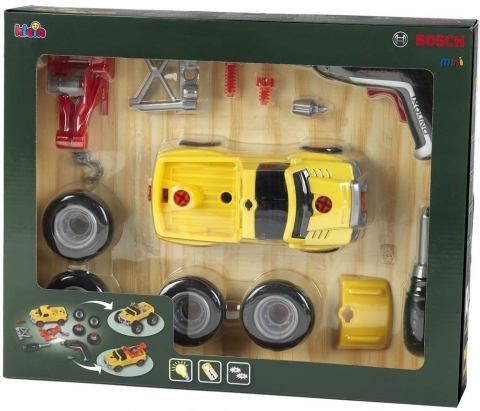 Zestaw zapakowany jest w zielony kartonik z transparentnym okienkiem przez które widać jego zawartość. Komplet składa się z żółtego samochodu do skręcania 3 w 1, który można skręcić tak, aby był pick-upem, autem terenowym lub holownikiem, a także zabawkowej wkrętarki Bosch Ixolino II działającej na baterie i wyposażonej w obroty w prawą i lewą stronę oraz charakterystyczny efekt dźwiękowy silniczka, imitujący pracę prawdziwego urządzenia. Dodatkowo w zestawie znajduję się jeszcze zabawkowy śrubokręt Bosch z ciemno-zieloną rączką, dwie czerwone konstrukcyjne śruby, żółta maska auta, cztery wymienne koła terenowe, czerwony hak holowniczy, który można zamontować na przyczepie auta, srebrna rama z reflektorami. Ten wyjątkowy zestaw zapewni dzieciom wspaniałą zabawę, podczas której nie tylko będą mogły pomajsterkować, używając narzędzi, które do złudzenia przypominają te prawdziwe, ale także samodzielnie zbudować auto, którym później można się do woli bawić. Auto można skręcić na trzy różne sposoby, dzięki czemu zabawka ta szybko się nie znudzi, a dzięki solidnemu wykonaniu będzie służyć przez długi czas. Zabawka wymaga użycia baterii, które nie są zawarte w zestawie.