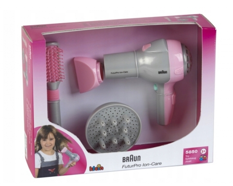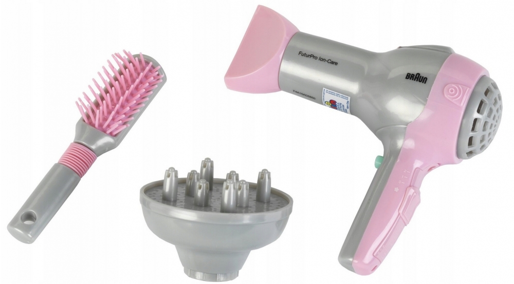 Dzięki zabawie suszarką Braun z dyfuzorem i szczotką, stylizuj i układaj fryzury jak prawdziwa fryzjerka! Suszarka dmucha powietrzem, ale nie nagrzewa się, dzięki czemu jest całkowicie bezpieczna w użytkowaniu przez dzieci. Zabawka stworzona jest na licencji firmy Braun i swoim wyglądem nawiązuje do urządzenia istniejącego w rzeczywistości. Zabawka jest nie tylko bezpieczna w użytkowaniu, ale sprawia również, że dziecko czuje się jakby korzystało z prawdziwej suszarki. Niemiecka firma Klein specjalizuje się w tworzeniu zabawek na licencji. Małe, plastikowe zabawki wyglądają niczym prawdziwe, elektroniczne urządzenia codziennego użytku. Kolekcja suszarek Klein na licencji Braun jest propozycją skierowaną głównie dla dziewczynek. Seria oferuje szeroką gamę produktów doskonale uzupełniających się na wzajem. Podczas zabawy dzieci mogą naśladować zaobserwowane w świecie dorosłych sytuacje. Zabawka wymaga użycia baterii, które nie są częścią tego zestawu.