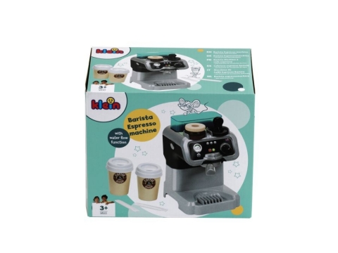 Zestaw Barista wyposażony jest w pojemnik na wodę i funkcję przepływu. Dzieci z przyjemnością częstują swoje lalki, pluszowe misie, a nawet mamę, tatę, babcię i dziadka espresso w swoich kuchniach do zabawy. Ten nowoczesny i przyjazny dzieciom ekspres do kawy idealnie się do tego nadaje: wystarczy napełnić zbiornik wodą, włożyć kapsułkę z kawą, docisnąć ją ubijakiem jak profesjonalny barista, a następnie nacisnąć przycisk włączania. Woda spływa do atrakcyjnej filiżanki niczym fantazyjna kawa i można ją podać. Zabawa dla wszystkich grup wiekowych!