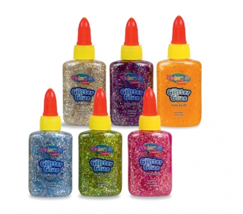 - Klej brokatowy w kolorach tęczy do błyszczących dekoracji.