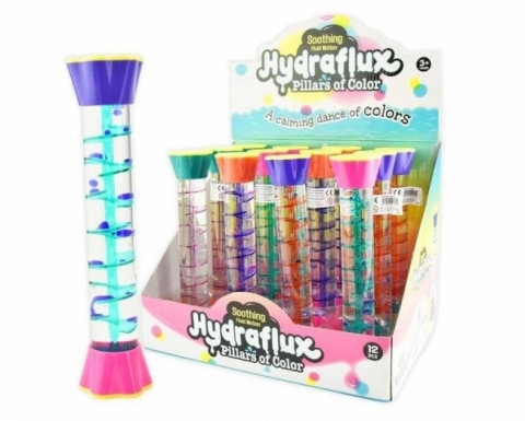 Klepsydra wykonana jest z przeźroczystego, gładkiego w dotyku tworzywa. W środku znajduje się płyn o konsystencji żelu. Po obróceniu zauważamy powolne przelewanie się i mieszanie cieczy w bardzo powolnym tempie. Spirala dodatkowo spowalnia ruch oraz magicznie rozdziela poszczególne krople. Obserwacja pozwala nam uspokoić wzrok, wyciszyć myśli. Dobrze wpływa na koncetrację wzrokową.