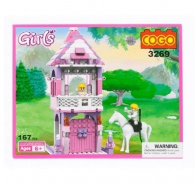 Klocki konstrukcyjne 167 elementowe, piękny zamek z księżniczką i rycerzem na białym koniu,