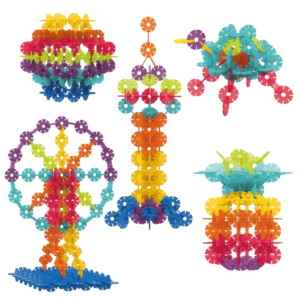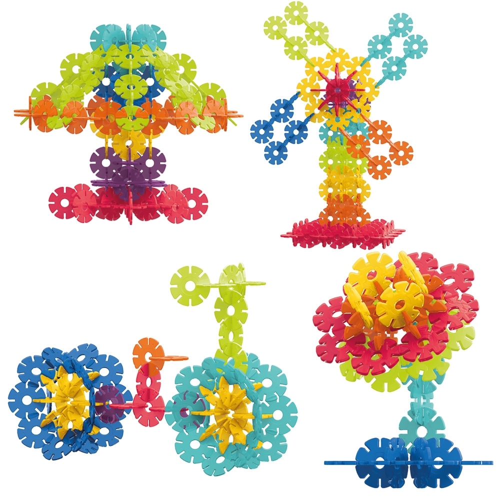 Nietypowy kształt „śnieżynek” sprawia, że elementy można łączyć w wielu kierunkach, co daje niemal nieograniczone możliwości zabawy – od prostych form po rozbudowane budowle.