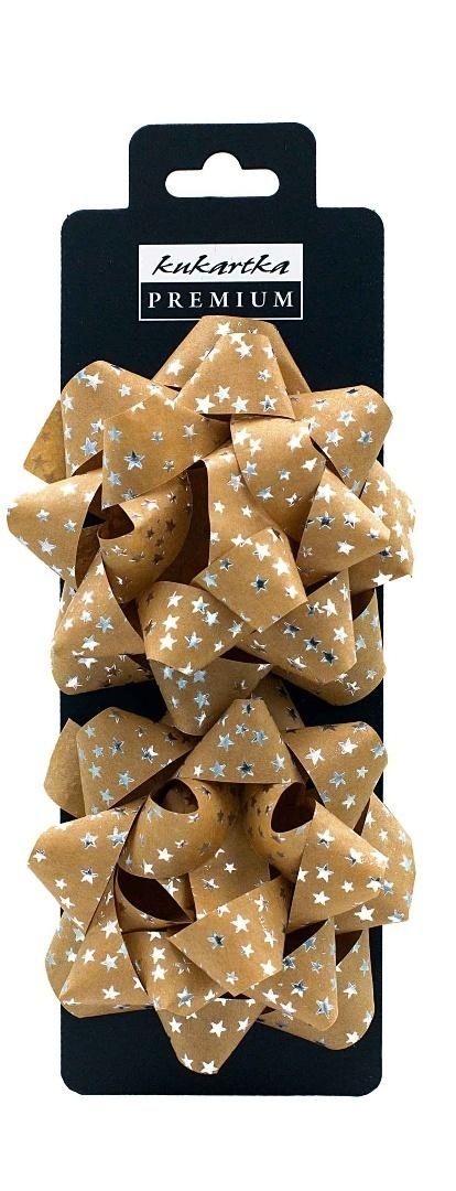 Kokardy wykonane z papieru kraft uszlachetnione dodatkowo metalizowanymi foliami.
