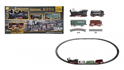 Kolejka w stylu retro z torami, lokomotywą i wagonikami. Zestaw umożliwia zbudowanie pełnego toru i zabawę w prowadzenie pociągu. 16 elementów w komplecie.