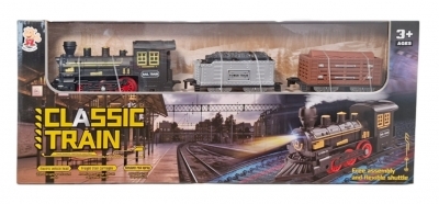 Lokomotywa z wagonami towarowymi. Pociąg z efektami świetlnymi i dźwiękowymi, ma możliwość rozbudowy torów. Całość zawiera 10 elementów. Zabawka działa na baterie AA. Baterie nie są załączone do zabawki. Zabawka przeznaczona dla dzieci od lat 3. Zapakowana w kartonowe pudełko. Podane wymiary są wymiarami.