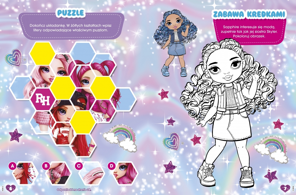 Dołącz do uczennic Rainbow High i odkryj świat pełen mody, sztuki i niezwykłych pomysłów. W książce znajdziesz różnorodne zadania, które pobudzają kreatywność i pozwalają zanurzyć się w wyjątkowy, kolorowy styl tej niezwykłej szkoły.